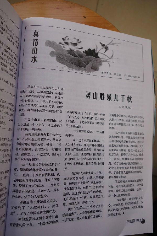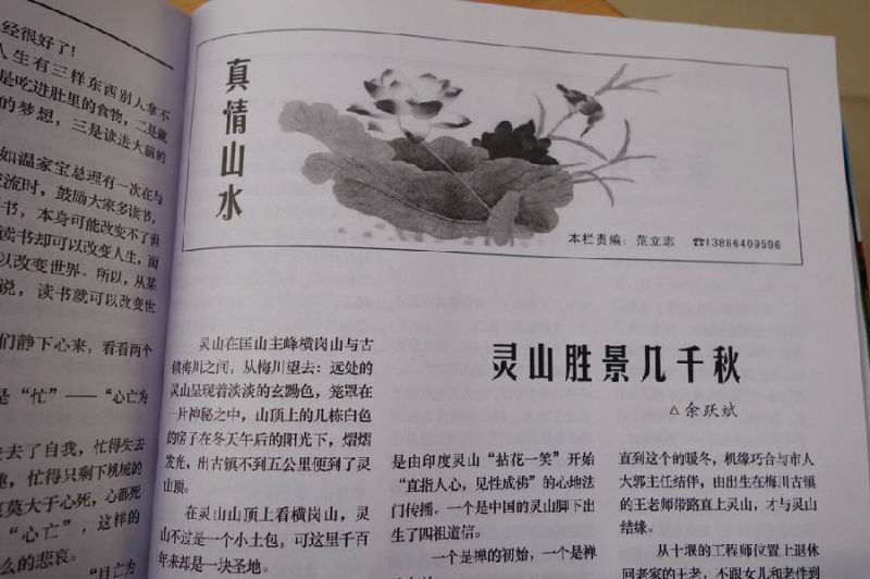 .Mft+," 春自家乡来 z?) RF[ hu*>B 门铃响着好听的乐声,邮递员送来了快件。 CH_Dat> 这封带着家乡气息的快件,也带来了家乡春的讯息,顷时,我的脑际浮现出了极好的、家乡春的景致。 `q{'_\gVt( 春来时,家乡四十五万亩的油菜花,会把家乡变成花的海洋;泛着金黄的油菜花儿,蜜蜂在追逐着,也在游人的耳际边嗡嗡作响,这是我对家乡春的最深记忆。 D30Z9_^%: 前些时,我还对厦门的摄影家朋友说:“春天油菜花开的季节,上我家乡吧!那是寻春好去处,莺飞草长,满山清翠欲滴,满畈金灿灿,你一定会陶醉在那春的海洋里。 w#bbm'j7r 家乡的梅川,是一个人文丰厚的鄂东名镇,出了新华社社长郭超人、民国三朝元老居正,这样的近现代名人,又是禅祖四祖道信的出生地,因而梅川也被称为天下祖庭,是参禅敬佛的好地方。 X|lmH{kf 近些年,思乡情切。写了些小块文章,写了些我与家乡的小故事,放在网络上与朋友们一块分享,被家乡的《梅川》杂志发现,杂志的主编范青保找我索稿,我就把我写的《灵山四章》和我的诗人朋友张肇彭写的《梦驰鲍照读书台》诗推荐了给他,不想,刚刚到来的二零一五年的第一期就刊出了。 DdZ_2B2 其实老范也是我的老熟人,我做小青年时,在县的广播里总是听他写的广播稿,受他的影响,我也往县广播站投稿,可没采用过。 i2R]lE8 转眼,离开家乡二十多年了,我始终记得老范,也常常想起那时家家户户都有的小广播匣子,耳边响起“广济县人民广播站,现在开始广播”亲切的乡音,也记得老范采写的梅川公社的新闻。 `0vy+T5 老范退休了,可他却玩起了高大上,当起了梅川杂志的主编,捧着这本厚厚带着家乡味道的《梅川》,一股春风袭上心头,“君从故乡来,应知故乡事”,家乡的景致、家乡的朋友和亲人全在这本《梅川》里。 EjCzou ;? QAPTz 0lq4 FJH8O7 ED_5V@ bH]!~[ D_kzR MM$"6Jor T}x%=4<E TmH13N] [:'?}p ee[NZz UHHKI)( X}^gmu<Vla >7Q7H#~w